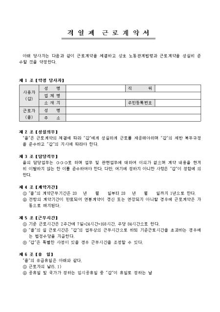 격일제 근무를 원칙으로 한다는 내용의 근로계약서입니다. 약정 당사자, 성실의무, 담당직무, 계약기간 등 16개 조항으로 구성되어있습니다.