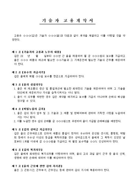 기술자 고용 시 사용할 수 있는 기술자 고용계약서입니다. 기술자의 고용과 노무의 내용, 보수의 지급시기, 을의 성실의무 등 9개 조항으로 구성되어있습니다.