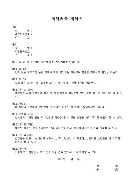 서약자 간의 계약커플을 서약한다는 내용으로 목적, 기간, 데이트의무, 비밀유지, 사생활보장 등 총 8개조항으로 구성된 계약커플 계약서입니다.