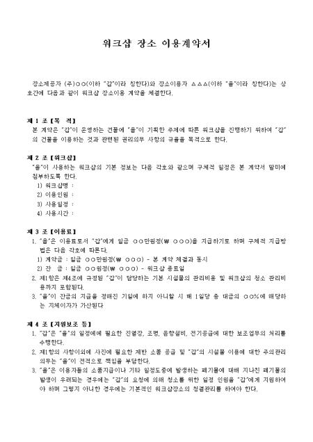 목적, 워크샵, 이용료, 지원보조, 안전관리, 일정연장, 장소변경 등 11개조항으로 구성되어 워크샵 장소 이용에 대하여 계약을 체결한다는 내용의 워크샵 장소이용계약서입니다.