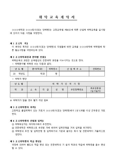 직원들에 대한 교육을 대학에 위탁함에 따른 필요사항을 약정해 놓은 위탁교육계약서입니다. 목적, 위탁과정과 분야별 인원, 위탁생의 자격 등 12개 조항으로 구성되어있습니다.
