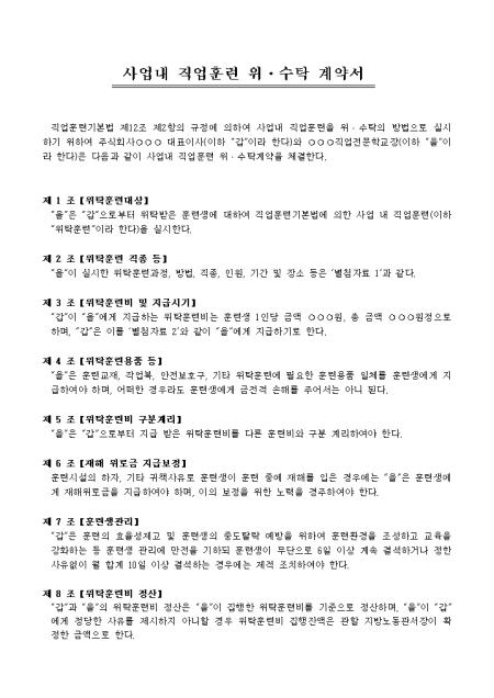 사업내 직업훈련을 위·수탁의 방법으로 실시하기 위하여 사업내 직업훈련 위·수탁계약을 체결할 때 사용하는 사업내 직업훈련 위·수탁 계약서입니다. 위탁훈련대상, 위탁훈련 직종, 위탁훈련비 및 지급시기 등 13개 조항으로 구성되어있습니다.