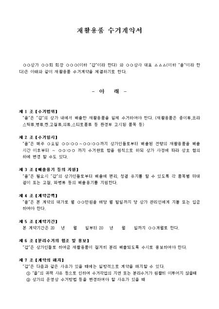 상가에서 재활용품 관련업체와 계약을 할 때 사용할 수 있는 서식으로 수거범위, 수거일시, 계약금액, 계약기간 등 8개조항으로 구성되어있는 재활용품 수거계약서입니다.