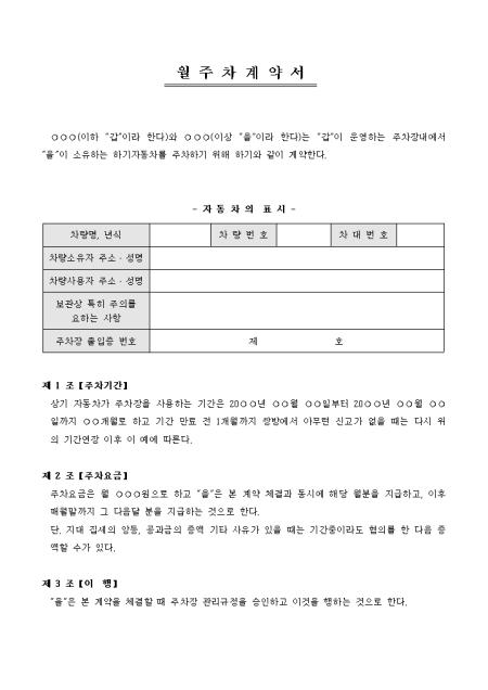 주차장업체와 월간 주차 계약을 하고자 할 때 사용할 수 있는 월주차계약서입니다.차량명, 차량소유자, 주의사항 등의 항목으로 구성되어있습니다.