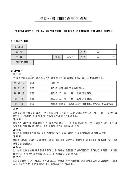 오피스텔 관련 부동산 매매 및 양도 계약 시 사용할 수 있는 오피스텔 매매(양도)계약서입니다. 부동산의 표시, 계약내용 등의 항목으로 구성되어있습니다.