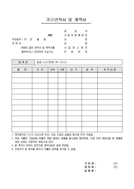 합계금, 품명, 규격, 단위, 수량 등의 항목으로 구성되어있는 가구 견적서 및 계약서입니다.