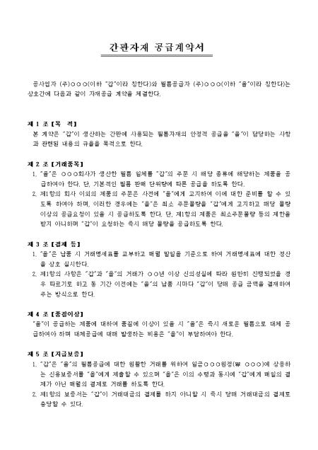 공사업자 필름공급자 상호간에 자재공급 계약을 체결하는 내용의 간판자재 공급계약서입니다. 목적, 거래품목, 결제 등 12개 조항으로 구성되어있습니다.