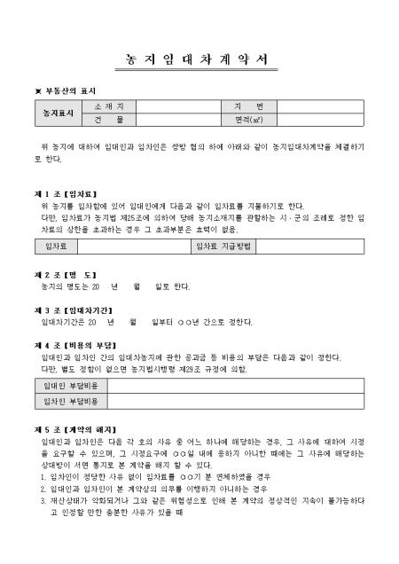 임대인과 임차인 상호간에 체결한 농지 임대차계약서입니다. 임차료, 명도, 비용의 부담, 계약의 해지 등 6개 조항으로 구성되어있습니다.
