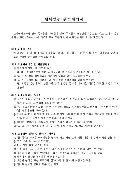 영농의 위탁 및 관리에 관한 목적으로 작성된 위탁영농 관리계약서입니다. 목적, 매매대금 및 지급방법, 소유권의 양도 등 8개 조항으로 구성되어있습니다.