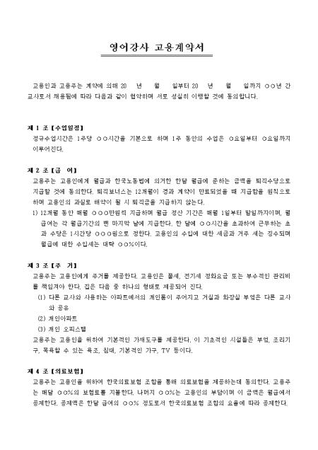 외국인 영어강사의 고용계약서입니다. 수업일정, 급여, 주거, 의료보험, 업무 등 8개 조항으로 구성되어있습니다.