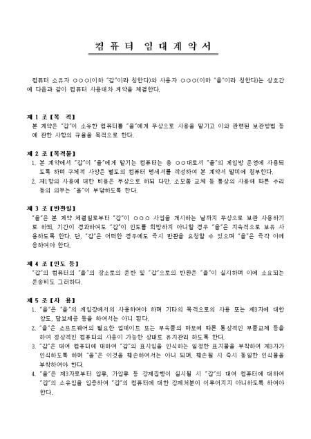 컴퓨터를 무상으로 사용을 맡기고 이와 관련된 보관방법 등에 관한 사항의 규율을 목적으로 작성된 컴퓨터 임대계약서입니다. 목적, 목적물, 반환일, 인도 등 12개 조항으로 구성되어있습니다.