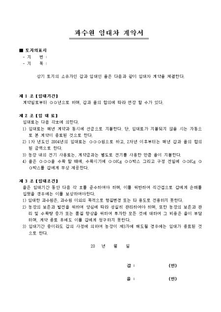 과수원 임대차계약 시 사용할 수 있는 과수원 임대차계약서입니다. 임대기간, 임대료, 임대조건 등의 항목으로 구성되어있습니다.