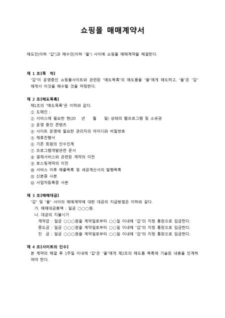 쇼핑몰사이트와 관련된 '매도목록'의 매도품을 매도매수할 목적으로 작성된 쇼핑몰 매매계약서입니다. 목적, 매도목록, 매매대금 등의 항목으로 구성되어있습니다.
