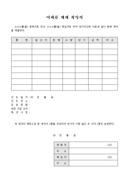 어패류 매매체결 계약시 사용합니다. 원산지와 중량, 금액등을 기록할수 있습니다.
