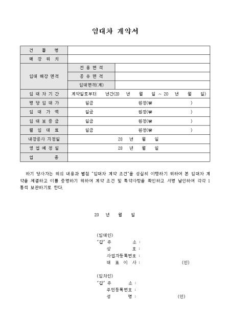 임대차 계약시 사용하는 계약서 양식으로 건물명, 임대매장면적, 월 임대료, 업종 등의 항목을 작성합니다.