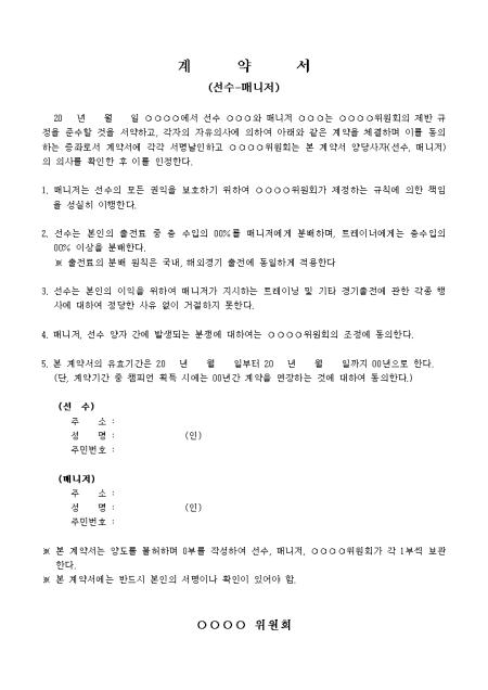 격투 선수와 매니저간의 계약에 관한 준수사항 및 서약사항을 명시한 계약서 양식으로 총 5개조 항목으로 구성된 서식입니다.