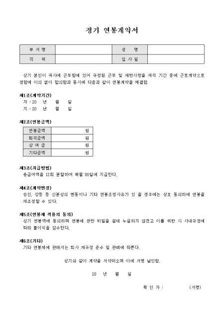 연봉계약 체결시 사용하는 정기 연봉 계약서입니다. 연봉금액과 지급방법등으로 구성되어 있으며 계약내용이 포함되어 있습니다.