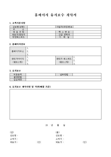 홈페이지의 유지보수에 대한 내용을 계약 할 때 사용하는 유지보수 계약서입니다. 유지보수 계약 사항과 비용을 기록 할 수 있도록 구성되어 있습니다.