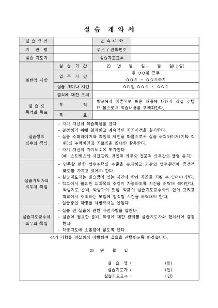 사회복지 실습시 사용할 수 있는 실습 계약서로 기관명과 실습생의 정보 및 실습 목적과 책임, 의무 등을 기록합니다.