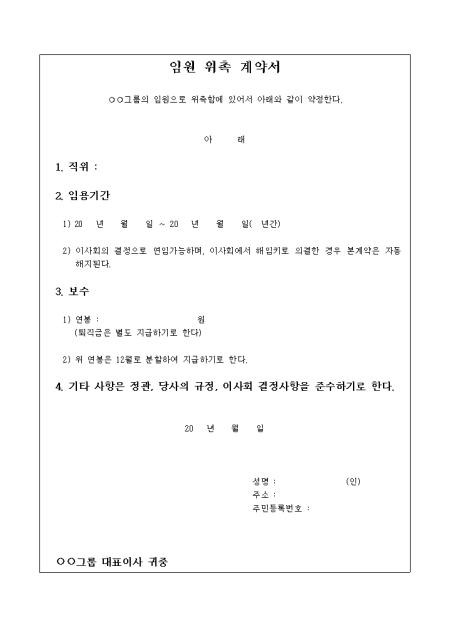 기업에서 임원으로 위촉이 된 인원과의 계약을 하고자 할 때 사용할 수 있도록 만들어졌으며 임원으로 위촉시 준수사항 및 계약조건 등의 항목을 기재할 수 있게끔 제작된 서식입니다.