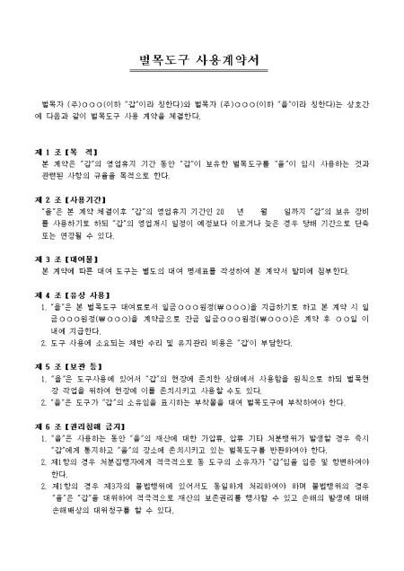 벌목도구를 임시로 사용하는 것과 관련된 사항의 규율을 정하는 목적으로 작성된 벌목도구 사용계약서입니다. 목적, 사용기간, 대여물, 유상사용 등 9개 조항으로 구성되어있습니다.