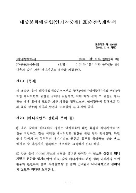 대중문화예술인(연예인, 연기자 중심) 표준전속계약서입니다.