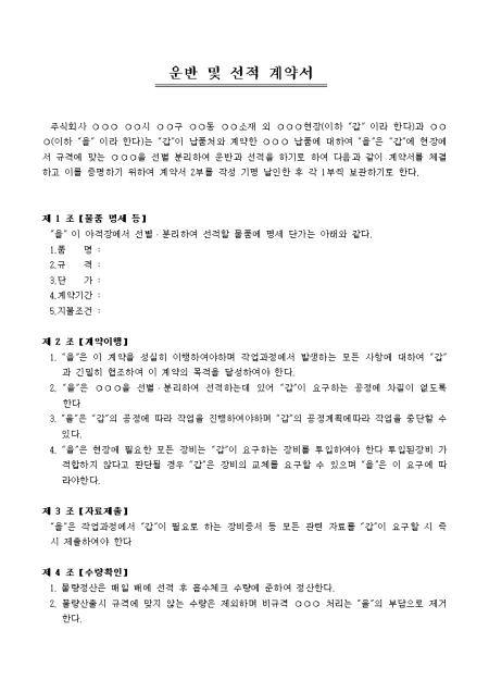 운반 및 선적업무에 관한 약정으로 상호간 업무조율을 목적으로 작성된 운반 및 선적계약서입니다. 물품명세, 계약이행, 자료제출, 수량확인, 손해배상 등의 항목으로 구성되어있습니다.