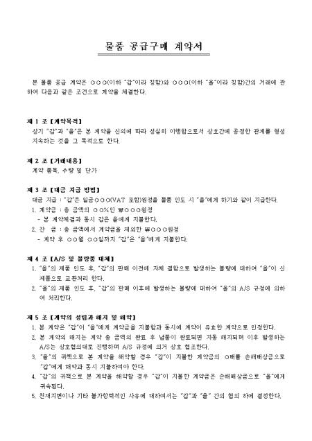 계약목적, 거래내용, 대금 지급 방법 등 6개 조항으로 구성되어있는 물품 공급구매계약서입니다.