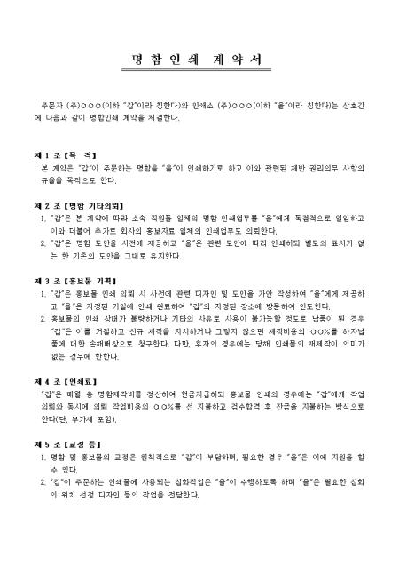 주문하는 명함을 인쇄하기로 하고 이와 관련된 제반 권리의무 사항의 규율을 목적으로 작성된 명함 인쇄계약서입니다. 목적, 명함 기타의뢰, 홍보물 기획, 인쇄료 등의 항목으로 구성되어있습니다.