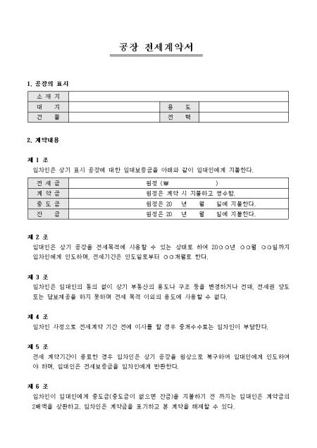 공장을 전세로 임대계약할 때 사용할 수 있는 공장 전세계약서입니다. 공장의 표시, 계약내용 등 7개 조항으로 구성되어있습니다.