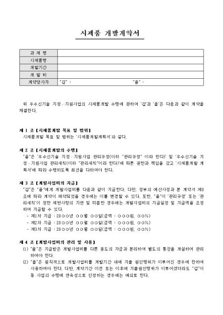 시제품 개발수행에 관한 계약체결 시 사용할 수 있는 시제품 개발계약서입니다. 세제품개발 목표 및 범위, 시제품개발의 수행, 개발사업비의 지급 등 16개 조항으로 구성되어있습니다.