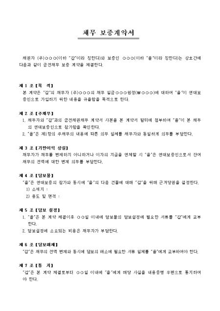 채권자와 보증인간에 금전채무 보증계약을 목적으로 작성된 채무 보증계약서입니다. 목적, 주채무, 기한이익 상실, 담보물 등 10개 조항으로 구성되어있습니다.