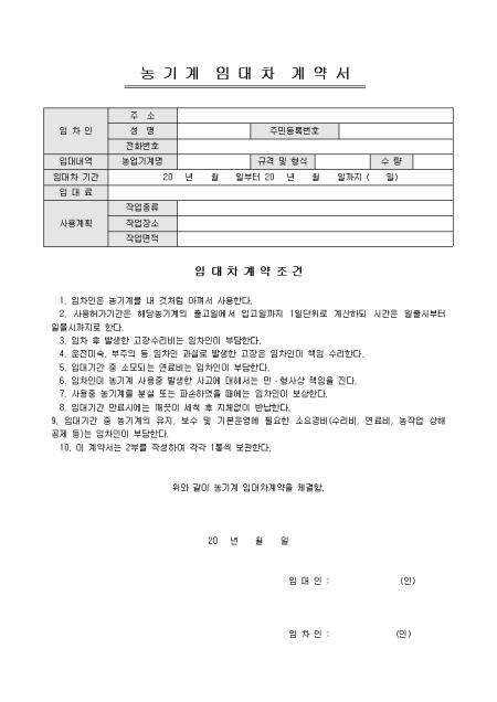 농기계에 관한 임대차계약서입니다. 임차인, 임대내역, 임대차 기간, 임대료 등의 항목으로 구성되어있습니다.