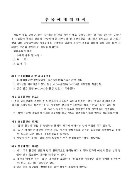 수목을 매매하기 위해 구체적인 조건을 정하여 작성된 수목매매계약서입니다. 매매대금 및 지급조건, 물건의 인도, 물건의 하자, 계약의 해제 등 7개 조항으로 구성되어있습니다.