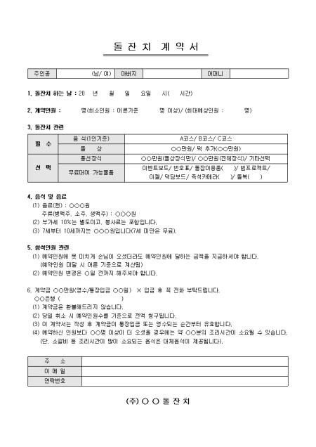 돌잔치업체와 계약 시 사용할 수 있는 돌잔치 계약서입니다. 돌잔치 하는 날, 계약인원, 돌잔치 내용 등의 항목으로 구성되어있습니다.