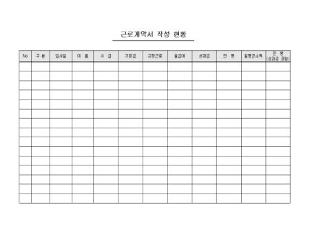 직원들의 근로계약서 작성 현황을 기록/ 관리할 수 있는 근로계약서 작성 현황표입니다. No, 구분, 입사일, 이름, 시급, 기본급 등의 항목으로 구성되어있습니다.