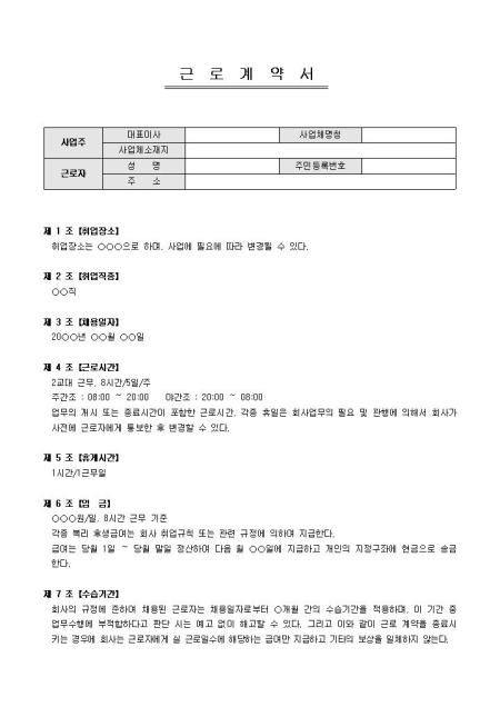 2교대 근무자의 근로계약서입니다. 취업장소, 취업직종, 채용일자, 근로시간 등 9개 조항으로 구성되어있습니다.