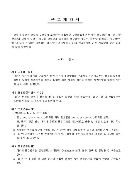관리의사 근로계약 체결 시 사용할 수 있는 관리의사 근로계약서입니다. 총칙, 성실이행의 의무, 근무시간 등 14개 조항으로 구성되어있습니다.