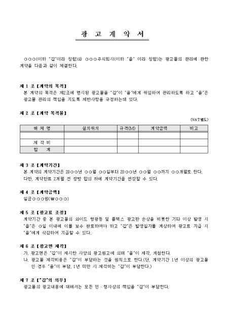 광고물의 관리에 관한 광고계약서입니다. 계약의 목적, 계약 목적물, 계약기간, 광고료 조정 등 12개 조항으로 구성되어있습니다.