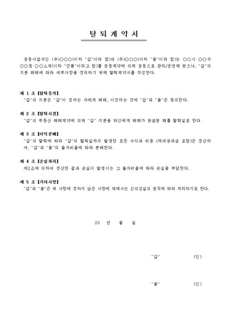 공동사업계약에 대해 탈퇴한다는 내용의 탈퇴계약서입니다. 탈퇴동의, 탈퇴시점, 이익분배 등 5개 조항으로 구성되어있습니다.