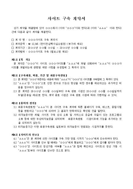 '갑'이 사이트를 '을'에 개발 의뢰하여 “을”이 사이트를 개발하는데 관련된 제반 사항을 규정함에 목적을 둔 사이트 구축 계약서입니다.