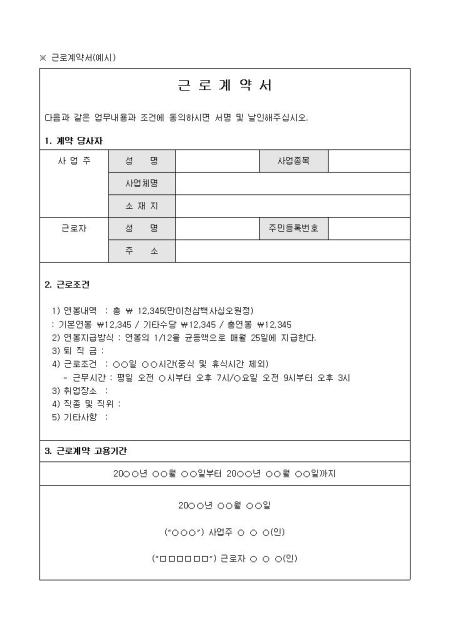 고용주와 근로자간에 체결하고 계약당사자, 근로조건, 근로계약 고용기간의 항목으로 구성된 근로계약서입니다.