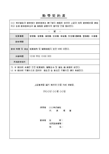 한문을 작성되어 있는 취업직종, 근로기간, 휴게시간, 기타근로조건을 작성하는 근로계약서입니다.