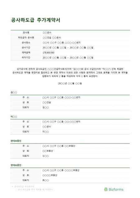 공사하도급을 추가할때 작성하는 계약서로 공사명, 공사장소, 공사기간, 계약금액 등의 항목으로 구성되어 있습니다.