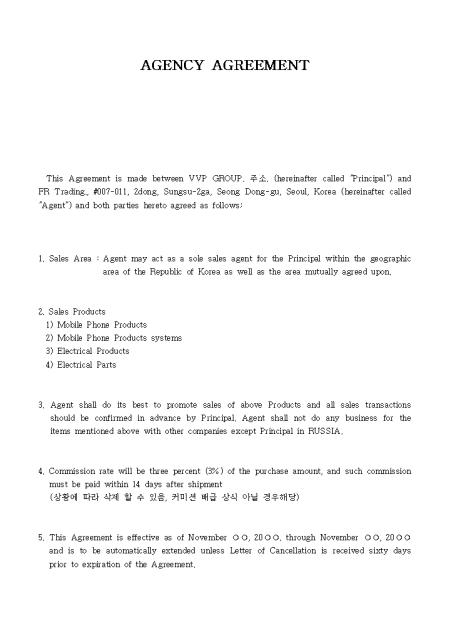 에이전트 계약서【AGENCY AGREEMENT】로 Sales Area, Sales Products, Commission rate 등의 내용으로 작성되어있습니다.