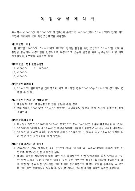 회사간 국내 독정공급계약을 체결하는 내용의 계약서입니다. 목적, 품명, 판매지역, 인도가격 및 판매가격, 결제조건 등 9조항으로 구성되어있습니다.