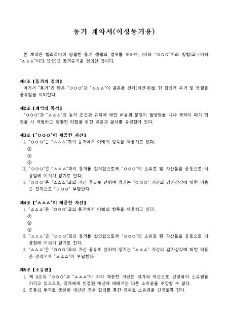 동거의 정의, 계약의 목적, 갑.을의 자산, 소유권 등 15개조항으로 구성된 동거계약서입니다