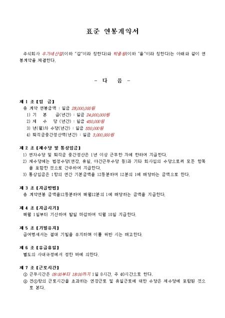 사업주와 근로자간에 연봉계약을 체결할 경우 사용할 수 있는 표준연봉계약서로써 14개의 계약조항으로 구성되어 있습니다. 제 1 조【임 금】